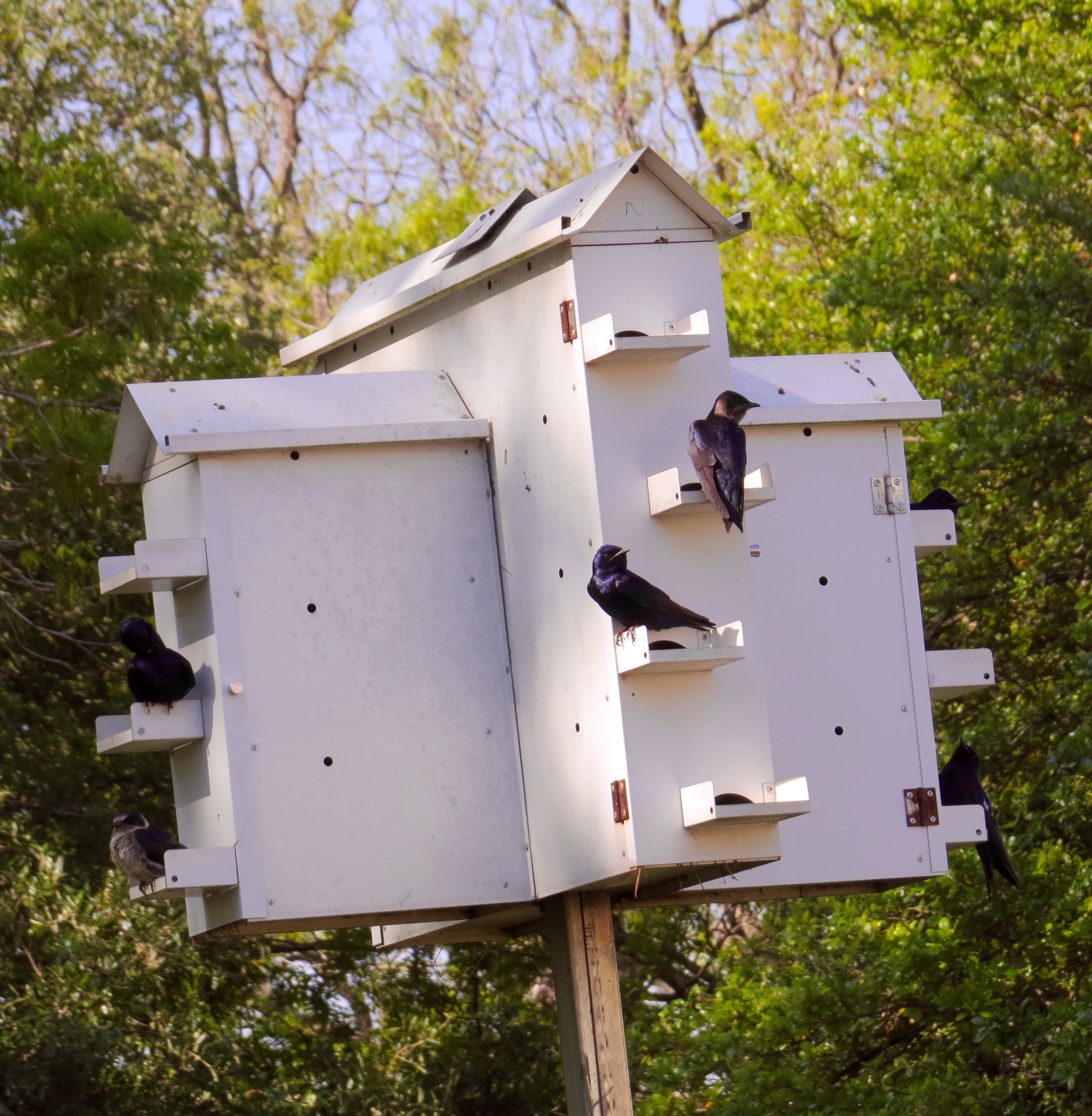Purple Martins are members of the swallow family. They eat and drink on the wing and spend our winter in South America. Landscapes in small towns and farms and even in urban areas, are dotted with purple martin houses erected to entice some of these interesting birds to take up residence, build a nest, lay their eggs and raise their young all to the delight of the property owner. They are colonial nesters which explains the preponderance of condominium style purple martin houses erected by homeowners.