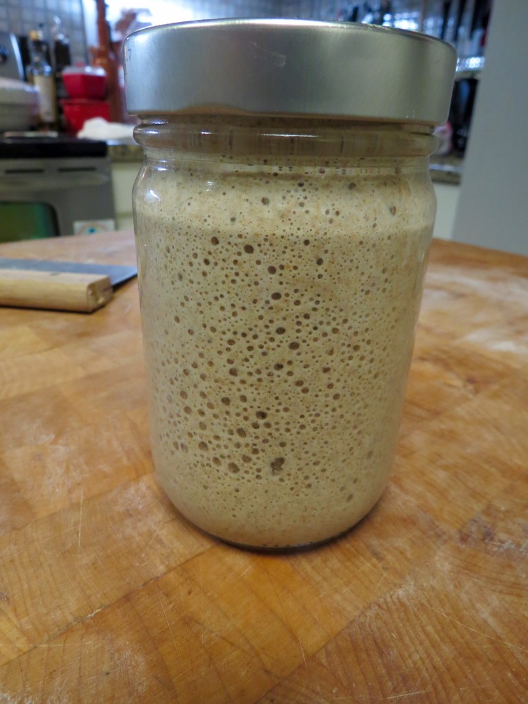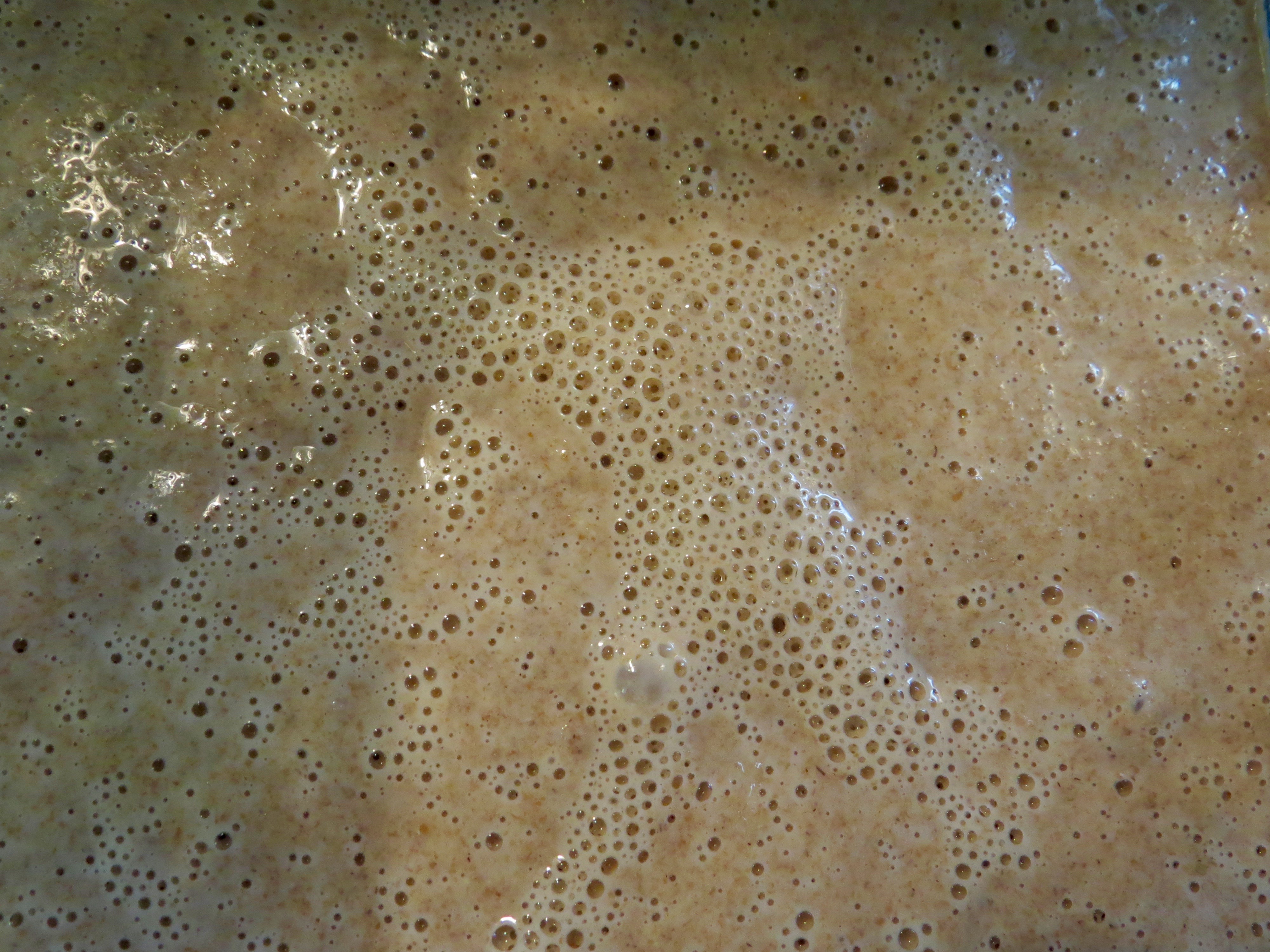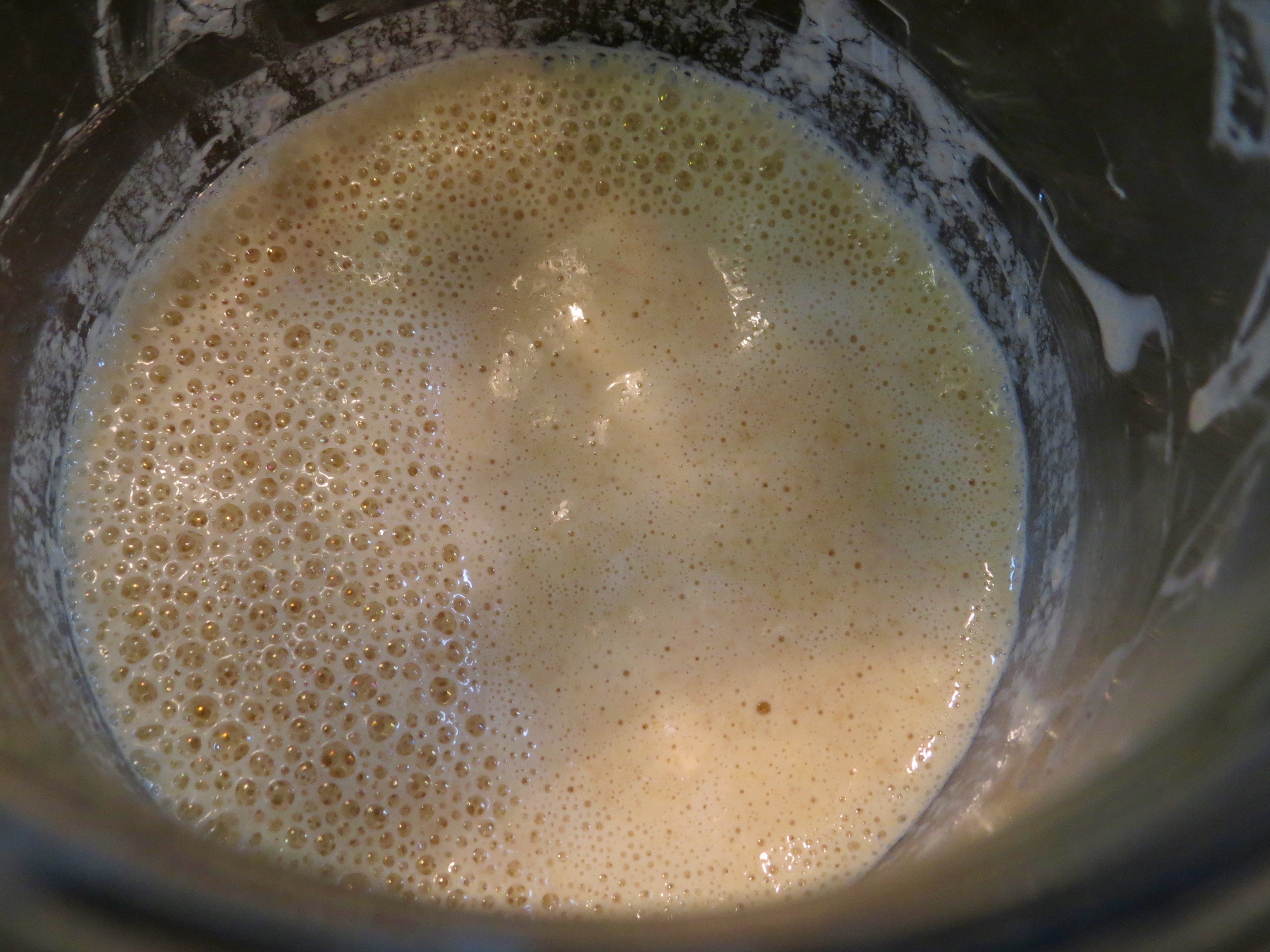 I have two different concoctions growing right now from two different book recipes. One was simple to mix and only requires that I stir it once daily for five days. This recipe came from the Tassajara Bread Book…1 tablespoon dry yeast, 2 1/2 cups warm water, 2 teaspoons honey, 2 1/2 cups flour mixed together, covered and left to brew for five days.