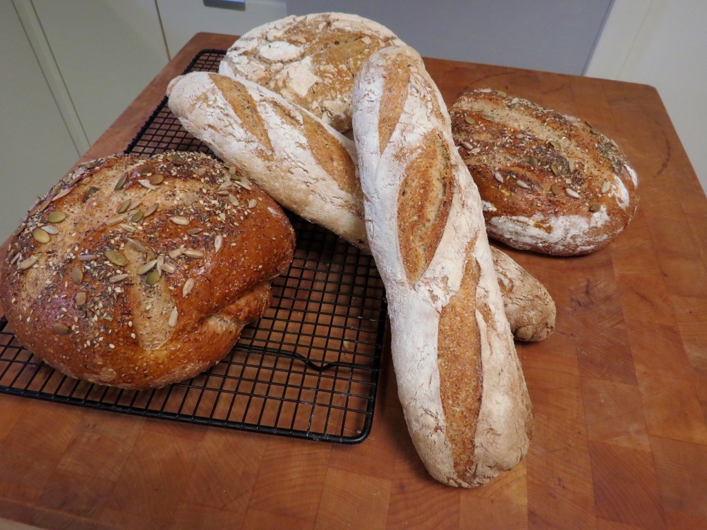 Two Multigrain Dakota bread loaves and three Rye Sour Dough