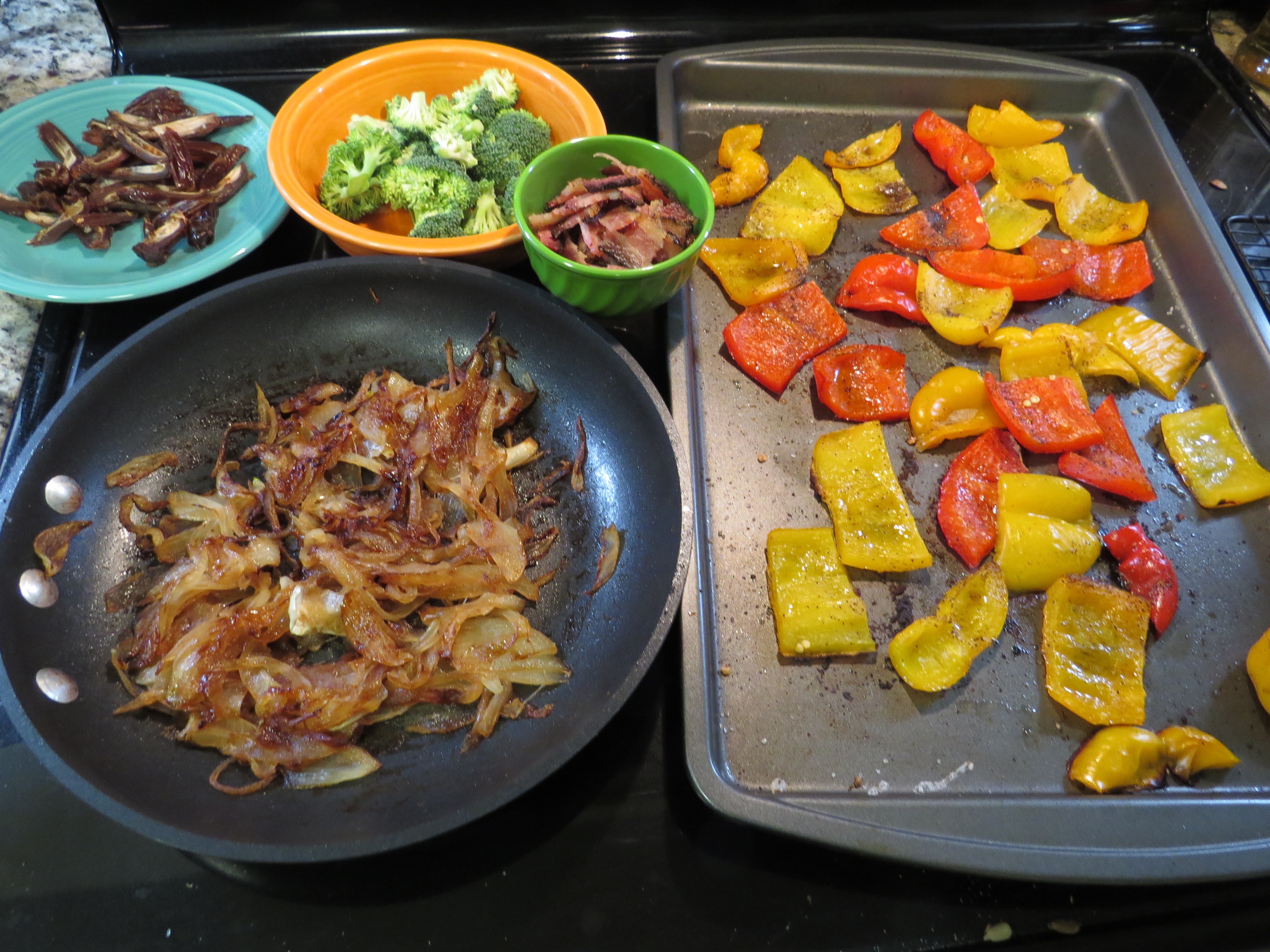 Yesterday I tackled making pizza dough for the first time. Just plain old pizza dough. Using my Kitchen Aide, mixing the dough was easy and it doubled in size in about two hours. While it was rising, I prepped the toppings for my pizza. Next I gathered the dough into a ball and pressed it out on my pizza peel that was lightly dusted with flour. I was even able to pick the dough up and stretch it by moving my fists around and around like you see in the movies. With practice I might be able to send the dough flying. It stretched quickly to the size I wanted and after topping it, baked in a 475 degree oven for about 20 minutes.