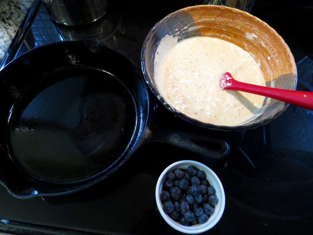 I eventually found my way to loving pancakes as children often do with certain foods when they enter adulthood. And my love of blueberry pancakes swimming in butter and smothered in warm authentic maple syrup is second to none. So this morning I made blueberry pancakes for me and my daughter for a late breakfast. And they were certainly “sour”. That slight watering that occurs inside your cheeks when we eat something sour was definitely present. I had some difficulty finding the right temperature for my cast iron pan with my electric stove. (So wish I had gas but not allowed in my condo cause I think they worry about us blowing the place up!). They were too sour or “vinegary” (my daughter’s word) for her. But for a first effort and a young sourdough starter they weren’t half bad. I didn’t get the rise I wanted from the pancakes and think that perhaps I should have left my starter out overnight to come to room temperature. Next time. And next time about three times the blueberries. I saved about a cup of my starter, re-fed it and returned it to a clean jar in the fridge until next week. Boris is turning into a dependable friend in helping me produce some pretty delicious food.