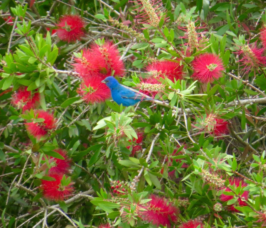 There is high drama in the wild green space behind my back garden. A local Road Runner skirts quickly through my back garden and up into the green belt in pursuit of breakfast. Road Runners can fly but definitely prefer to “run”. He darted and dashed making remarkably quick 90 degree turns and captured a rodent in astoundingly quick time, hurrying back through my garden to enjoy his meal. And this morning a gray fox trotted through with his latest catch and in the process startled a buck who immediately chased the fox away. I will never know the end of this story because they disappeared into the surrounding trees and bushes beyond my view. As I complete this piece a resident squirrel races along the top of my back fence and a juvenile doe saunters by as butterflies, dragonflies, moths, bees, wasps, lizards and birds flit about exploring my new garden oasis and hopefully make a decision to share our common space.