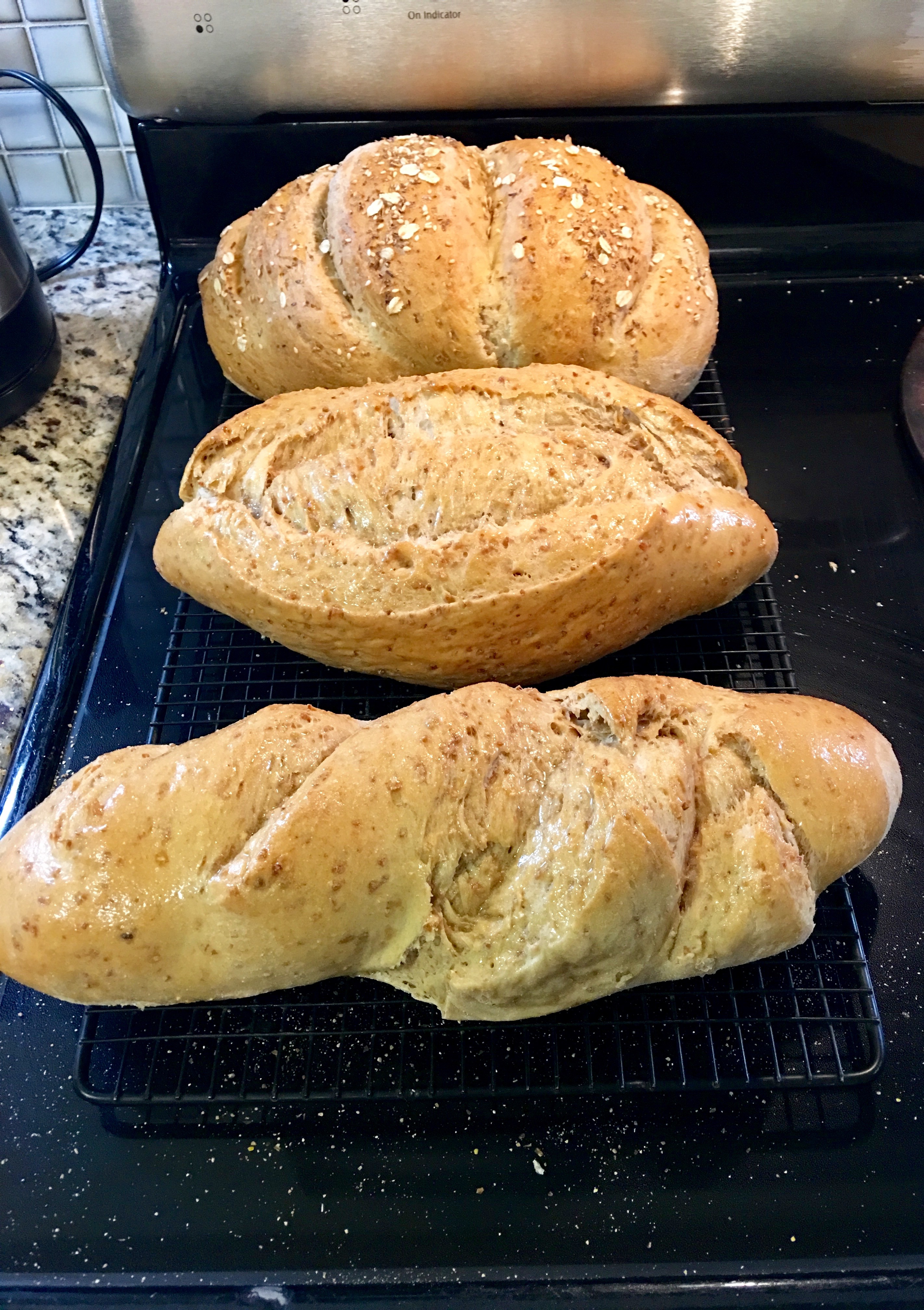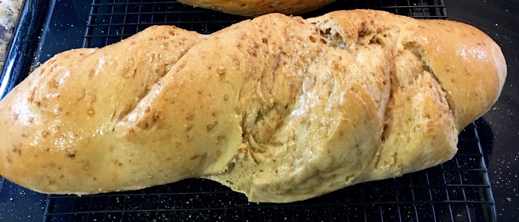 My sister immediately went to her bookcase and extracted two books on bread baking for me to peruse. We left her home and went to a delightful local bookshop to see if we could find other bread baking books. The quest had begun. With the bookstore stop behind us, we visited another local shop and did find a nice copy of the Great Big Cookie Cookbook. Should my adventure be baking my way through a book of cookie recipes? I knew my fellow workers would love the cookie option, but my heart was set on bread. I think my desire harkened back to when I was a young hippie-like Mother of two beautiful daughters and was following my desire to be a good steward of our planet, feed wholesome food to my children and baking bread was part of my twice weekly routine. The pushing, pulling, punching of the dough was a highly therapeutic and rewarding activity.  And the smell of baking bread titillated my senses as I awaited the hollow thump that verified it was ready. Slathering fresh butter on a slice of homemade bread fresh out of the oven is second to no culinary experience.